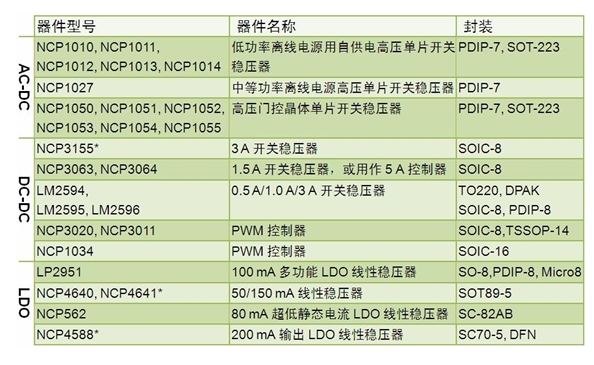 關穩(wěn)壓器 NCP3155、1.5 A 開關穩(wěn)壓器 NCP3063/4、0.5/1.0/3 A 開關穩(wěn)壓器 LM2594/5/6、NCP3020/11 脈寬調制(PWM)控制器及 NCP1034 PWM 控制器。