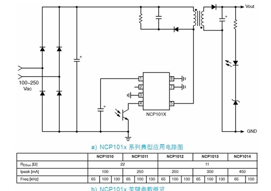 以 NCP101x 為例,這系列器件集成了固定頻率電流模式控制器及典型導通阻抗為 11 或 22 ? 的 700 V MOSFET,提供構建強固及低成本開關電源所需的全部特性,包括軟啟動、頻率抖動、短路保護、跳周期、最大峰值電流設定點及動態(tài)自供電(不需要輔助繞 組)等。在正常負載工作期間,NCP101x 以 65、100 及 130 kHz 中的某一頻率開關;而當電流設定點降到低于某個給定值(如輸出功率需求消失)時,NCP101x 自動進入所謂的跳周期模式(在此模式下跳除不需要的開關周期),從而提供極佳的輕載能效。由于進入跳周期模式通常發(fā)生在最大峰值電流的 1/4 時,故沒有可聽噪聲產(chǎn)生。因此,待機能耗降至最低,且沒有可聽噪聲產(chǎn)生。NCP101x 典型應用電路及不同型號的關鍵參數(shù)參見圖 2。