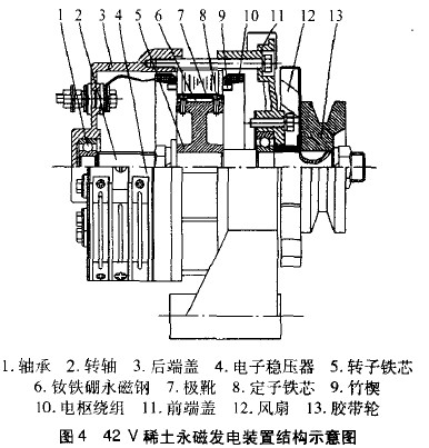 目前稀土永磁材料已經(jīng)具備了較高的性價比,現(xiàn)代電力電子技術(shù)也為研制出斬波式的電子穩(wěn)壓器奠定了基礎(chǔ)。因此,利用稀土永磁材料和現(xiàn)代電力電子元件研制出結(jié)構(gòu)簡單、發(fā)電效率高、壽命長的42V稀土永磁發(fā)電機具有較高的研究價值和廣闊的推廣前景。