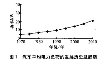 汽車電源的電壓從上世紀50年代的6V改為12V,己有50多年的歷史。自1990年開始,汽車用電量每年以5%~8%的比例增加,其平均電力負荷的發(fā)展歷史與趨勢見圖1。隨著汽車技術(shù)的不斷進步,將會有越來越多的電氣及電子系統(tǒng)被應(yīng)用到汽車上。