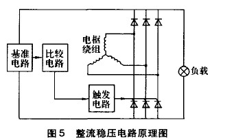 設(shè)計的釹鐵硼永磁發(fā)電裝置結(jié)構(gòu)示意圖如圖4所示,還研制了三相半控橋整流穩(wěn)壓電路(圖5)。該電路由三相半控橋整流電路、電壓信號取樣電路和觸發(fā)電路組成。當(dāng)發(fā)電機輸出電壓低于目標穩(wěn)壓值時,電子穩(wěn)壓器為三相整流輸出。當(dāng)發(fā)電機輸出電壓高于目標穩(wěn)壓值時,電壓信號取樣電路自動使三相半控橋整流電路瞬時斷開,降低輸出電醫(yī)當(dāng)發(fā)電機輸出電壓再低于目標穩(wěn)壓值時,三相半控橋整流電路再恢復(fù)工作,周而復(fù)始。通過整流、斬波,保證了發(fā)電機輸出電壓穩(wěn)定的直流電。