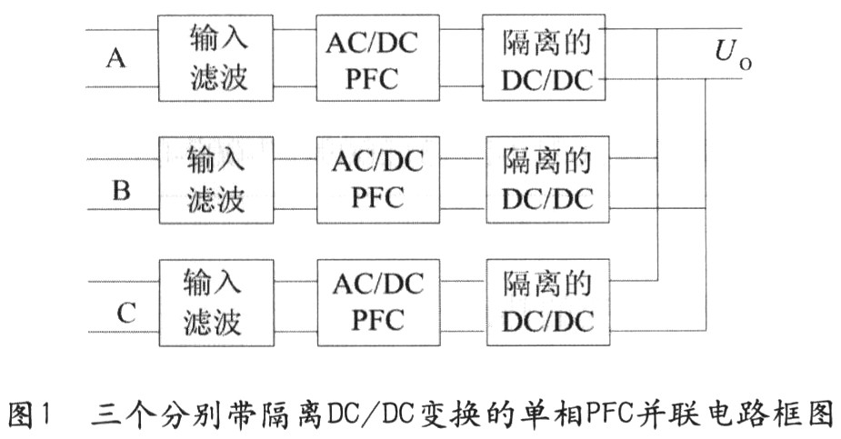 1)由三個分別帶隔離DC/DC變換的單相PFC并聯(lián)組成的方法