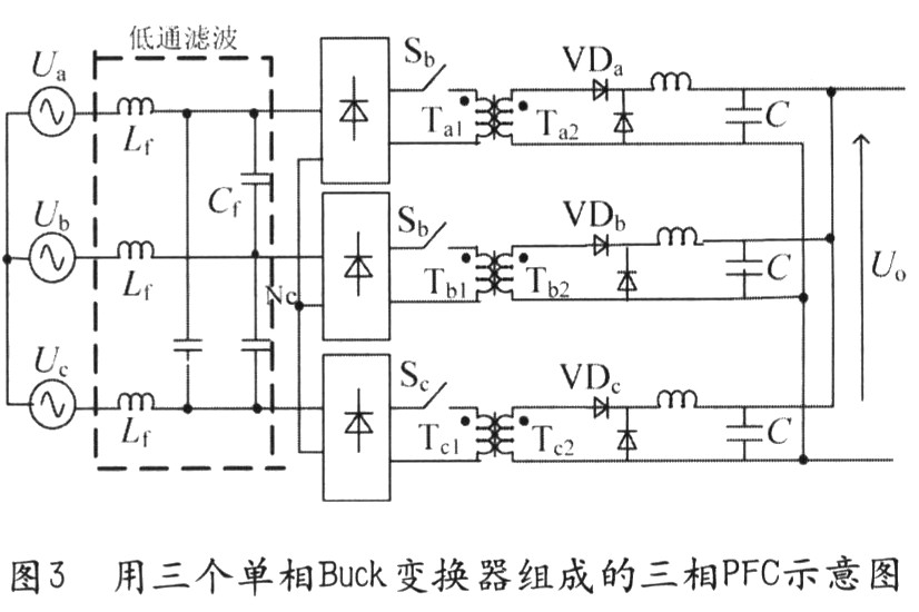 圖3用三個單相Buck變換器組成的三相PFC示意圖,圖3所示Buck型電路的結構比較簡單,同全橋電路相似,由于隔離變壓器反射電壓的影響,其相對于反激電路來說也有較大的電流失真,但其諧波仍可以限定在比較低水平,達到IEC—1000的要求。另外,其可實現(xiàn)的功率等級的大小不如全橋高,但比反激式電路要大。