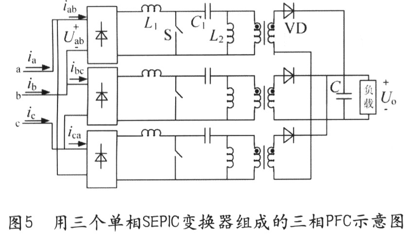 在Boost變換中,傳統(tǒng)的隔離在此種情況下的應用并不理想,因為在電流連續(xù)情況下,器件將產生高的電壓應力,在電流斷續(xù)情況下將產生較大的輸入電流失真。圖5所示的電路是用隔離SEPIC電路組成的三相PFC電路,SEPIC變換器的輸入端類似于Boost電路,因此具有Boost電路的優(yōu)點,如有低的輸入電流失真和更小的EMI濾波器。在輸出端SEPIC電路像反激式變換器,從而不必以增加電壓為代價達到隔離的作用。