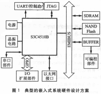 圖1是一種典型的嵌入式系統(tǒng)硬件設計方案。系統(tǒng)的微處理器采用S3c4510B,是基于ARM7體系結(jié)構(gòu)的。SDRAM是一種易失性存儲器作為程序的運行空間,類似于PC機的內(nèi)存;Flash作為程序存儲空間是非易失性的。程序運行過程中的數(shù)據(jù)往往緩存在sDRAM中,在系統(tǒng)失電時必須寫往Flash。