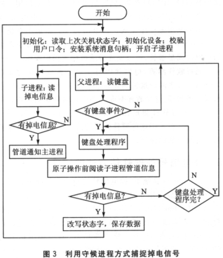 另一種方式是采用守候進程的方式,開通一個進程,此進程專門等待中斷信號。主程序根據(jù)數(shù)據(jù)操作對象的不同,將自己的流程方案劃分成若干原子操作,所謂原子操作即劃定的程序塊要么完全執(zhí)行,要么不執(zhí)行。每個操作對應惟一狀態(tài)標志。在每個原子操作前,主進程都將會通過管道通信的方式閱讀中斷信號。如果中斷信號產(chǎn)生,主進程首先保存狀態(tài)標志,然后將相關(guān)數(shù)據(jù)寫往Flash后退出,電源恢復后,主進程首先根據(jù)標志字確定系統(tǒng)恢復方案。圖3用流程圖的方式實現(xiàn)這一過程。