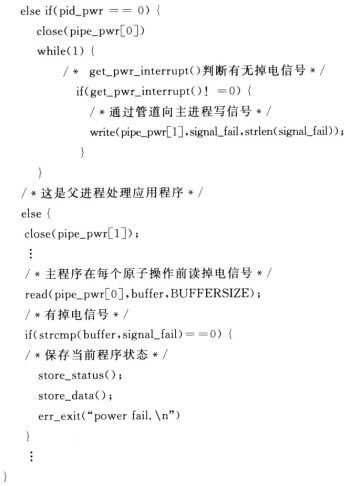 在μClinux系統(tǒng)下,掉電信號的捕捉有兩種方式可以進行。一種是運用系統(tǒng)調(diào)用,即采用void(*signal(intslg,void(*func)(int)))(int)。這個函數(shù)可以為特定的中斷信號安排制訂的執(zhí)行函數(shù),用參數(shù)func傳遞。在μCllnux中,共有31個系統(tǒng)中斷信號,其中掉電信號為SIGPWR。假設掉電中斷服務處理程序為void interrupt-service(int),則中斷服務與信號關(guān)聯(lián)的方式為:signal(SIGPWR,interrupt_service)。這種方式充分利用系統(tǒng)調(diào)用,實現(xiàn)簡單。在掉電保護方案設計初期也是采用這種機制。但事實證明這種機制并不可靠,其原因是Linux內(nèi)核產(chǎn)生和管理信號的機制并不完善,有可能存在信號丟失。查閱有關(guān)Unix或L1nux的相關(guān)資料,可以發(fā)現(xiàn)這種狀況也普遍存在于某些其他版本的Linux和Unix中。