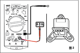 2.關(guān)閉點(diǎn)火開(kāi)關(guān),斷開(kāi)傳感器的電子連接接頭。黑色表筆插到儀器的“OUTPUT—”的插孔,另一端搭鐵(使用鱷魚(yú)夾),紅色表筆插到“+OUTPUT”插孔,另一端與傳感器的輸入信號(hào)線連接(可以使用萬(wàn)用測(cè)試線),如圖2所示。