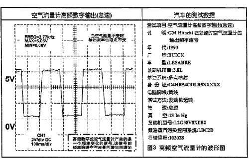 高頻數(shù)字式空氣流量計(jì)出現(xiàn)在通用汽車(chē)3.8L V6型發(fā)動(dòng)機(jī)上,它是日立(Hitachi)生產(chǎn)的傳感器。此外,高頻數(shù)字式空氣流量計(jì)還應(yīng)用于凌志(Lexue)以及其它汽車(chē)中。傳感器的脈沖大多數(shù)幅值為5V,怠速時(shí)頻率:2.77kHz。