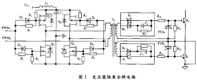 在中頻脈沖滲碳電源中,能快速進(jìn)行過流保護(hù)是至關(guān)重要的,而驅(qū)動(dòng)脈沖無延遲地傳輸,對實(shí)時(shí)過流保護(hù)起至關(guān)重要作用;同時(shí)為了減少開關(guān)損耗,還要求很陡的驅(qū)動(dòng)脈沖上升沿和下降沿;一些特殊場合要求緊湊而簡潔、不附加驅(qū)動(dòng)電源等。綜合考慮以上要求,采用變壓器隔離全橋驅(qū)動(dòng)電路,其電路如圖1所示。