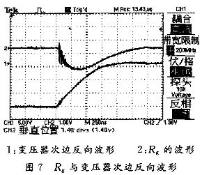 R1實(shí)際值很小,可以忽略。穩(wěn)壓二極管并聯(lián)在D1,C1兩端,它的電壓是D1和C1兩端電壓之和。穩(wěn)壓二極管是隨電流大小自動(dòng)調(diào)整的“可變”電阻。通過改變電阻來控制上升沿和下降沿的速率,從而達(dá)到控制過沖尖峰的大小。實(shí)測Rg與驅(qū)動(dòng)變壓器次邊反向波形如圖7所示。Rg上電壓波形即為勵(lì)磁電感上流過的電流波形。正脈沖下降沿的過沖尖峰由勵(lì)磁電感造成的: