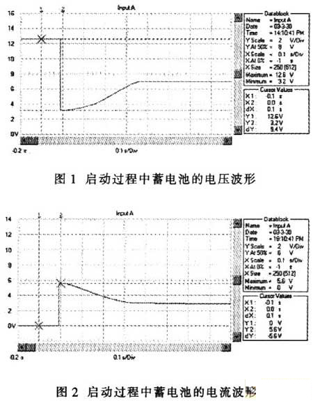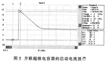 超級電容器與蓄電池并聯(lián)時,汽車啟動過程的電壓波形如圖4所示,電流波形如圖5所示。與圖1和圖2相比,啟動瞬間電壓跌落由只采用蓄電池時的3.2V提升到7.2V;啟動電流從560A提高到l200A;啟動瞬時的電源輸出功率從2kW上升到8.7kW;啟動過程的平穩(wěn)電壓由7V提高到9.4V;啟動過程的平穩(wěn)電流由280A提高到440A;啟動過程的電源平穩(wěn)輸出功率從2.44kW提高到4.12kW。