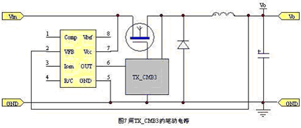 圖7示出的是采用TX_CMB3型驅(qū)動(dòng)模塊的斬波電路,該驅(qū)動(dòng)組件是北京落木源公司(www.pwrdriver.com)新開(kāi)發(fā)出的單管隔離驅(qū)動(dòng)器。該款驅(qū)動(dòng)器使用變壓器隔離,采用分時(shí)技術(shù),在輸入信號(hào)的上升和下降沿傳遞PWM的信號(hào),在平頂階段傳遞能量,因而能夠輸出陡峭的驅(qū)動(dòng)脈沖。這種驅(qū)動(dòng)方法的優(yōu)點(diǎn)是使用方便(在MOSFET功率不大時(shí),只要如圖7連接就可以了),驅(qū)動(dòng)脈沖質(zhì)量好,工作頻率高,體積較小,輸入電壓最高可達(dá)1000V,價(jià)格也比較便宜。缺點(diǎn)是工作頻率低時(shí)要求的變壓器體積比較大,同時(shí)成本稍高些,但考慮到簡(jiǎn)化了設(shè)計(jì)、并降低了裝配成本,總成本可能還要低些。