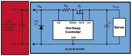 在熱插拔應用中,TVS主要用作需要被中斷的差模電流的接地分流路徑。熱插拔系統(tǒng)常被用在分布式電源系統(tǒng)中提供可靠的系統(tǒng)保護和電氣管理,典型服務器系統(tǒng)的線卡接口和熱插拔電路原理圖如圖5所示。