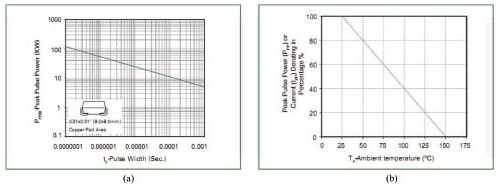 對瞬變電壓的吸收功率(峰值)與瞬變電壓脈沖寬度間的關(guān)系。手冊給的只是特定脈寬下的吸收功率(峰值),而實際線路中的脈沖寬度則變化莫測,事前要有估計。對寬脈沖應降額使用。