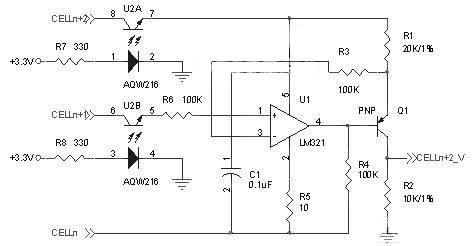 由于本文實(shí)驗(yàn)中采用的采樣電路參考電壓為2.5V,因此需要把電池電壓進(jìn)行2倍衰減,所以選擇了R1=2R2,電路中電容C1為去耦電容,電阻R5為限流電阻,電阻R4用于保證電路可靠工作,為了減少電壓檢測(cè)電路的漏電流,在每節(jié)單體電池電壓檢測(cè)線上加入AQW216光電繼電器作為檢測(cè)控制開(kāi)關(guān),如圖2所示,當(dāng)需要檢測(cè)電池電壓時(shí),通過(guò)控制端打開(kāi)光電繼電器,檢測(cè)完關(guān)閉光電繼電器,可有效減少檢測(cè)時(shí)的漏電流對(duì)電池組一致性的影響。