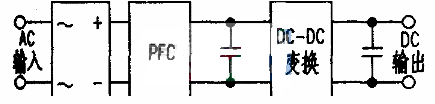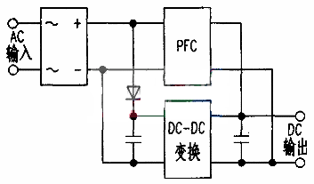 傳統(tǒng)的開關(guān)電源結(jié)構(gòu)如下圖,是將功率因數(shù)校正電路(PFC,PowerFactorCorrection)和DC-DC變換電路串聯(lián)起來。因而效率低,要減少待機(jī)功率也相當(dāng)困難。