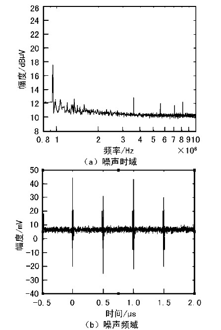 為了測試這種設(shè)計,用線性電源(0~32V,5A)來給數(shù)字PCB供電。這樣選擇的線性電源不會引入高頻噪聲影響測試結(jié)果。直流輸入噪聲的時域和頻域圖如圖1所示。圖1中可以看出,頻率1MHz的噪聲最大,因此EMI濾波器要抑制頻率為1MHz的噪聲。