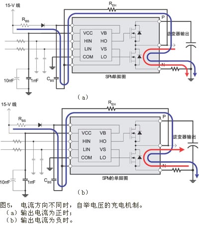 MOSFET逆變器的另一個(gè)優(yōu)點(diǎn)是圖4(e)所示的自舉電壓(陰極輸出電壓)。從圖4(e)可以看出,電機(jī)的工作頻率為10Hz。圖中畫出了自舉電壓和逆變器輸出電流。當(dāng)電流為正時(shí),自舉電壓VBS維持在VCC=15V附近,但當(dāng)電流為負(fù)時(shí),VBS就下降到接近10V。這是由于不同電流方向采用不同的充電機(jī)制所造成 (參見圖5)。當(dāng)輸出電流為正時(shí),電流要么流經(jīng)高壓側(cè)MOSFET,要么流經(jīng)低壓側(cè)體二極管。在這種情況下,當(dāng)?shù)蛪簜?cè)體二極管導(dǎo)通時(shí),將對(duì)自舉電容CBS充電 (參見圖5(a))。此時(shí),對(duì)CBS的充電電壓可由公式(2)表示。