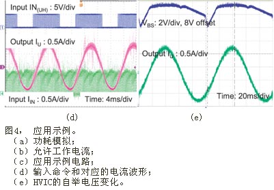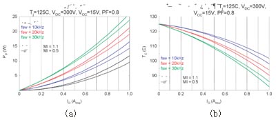 圖4給出了本模塊的一個(gè)應(yīng)用示例。在圖4(a)和(b) 的模擬中,假設(shè)結(jié)區(qū)溫度Tj保持為125℃;該溫度為本模塊的最大工作結(jié)區(qū)溫度。通過這項(xiàng)模擬,肯定當(dāng)模塊外殼溫度控制在100℃并采用空間向量調(diào)制 (SVPWM) 時(shí),輸出功率可大于Pout=100W,并允許Pd=16W的功率損耗。根據(jù)這些信息,我們利用一臺(tái)130W BLDC電機(jī)(正弦反電動(dòng)勢(shì)) 和圖4(c)所示的電路,對(duì)模塊的額定功率進(jìn)行驗(yàn)證實(shí)驗(yàn)。實(shí)驗(yàn)中采用的散熱片有效表面積約為100cm2。采用該散熱片后,模塊在20kHz SVPWM下可向電機(jī)輸出150W的功率;熱功耗為12W。而此時(shí)模塊的外殼溫度為86℃,MOSFET結(jié)區(qū)溫度為104℃,環(huán)境溫度27℃。在同樣條件下采用圖4(d)所示的非連續(xù)PWM時(shí),由于有效開關(guān)頻率降低,模塊的功耗可達(dá)到8W,而逆變器效率可達(dá)到95%。此時(shí),模塊的外殼溫度為62℃,結(jié)區(qū)溫度為82℃(已考慮電機(jī)鐵芯的損耗),逆變器的損耗為整個(gè)系統(tǒng)功耗的27%