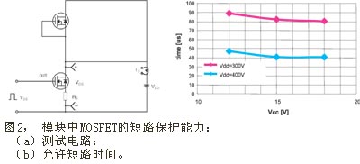 MOSFET的另一個(gè)優(yōu)勢(shì)是其耐用強(qiáng)度。它比IGBT的耐用強(qiáng)度高;與額定功率相同的其它器件相比,具有更寬的安全運(yùn)行區(qū) (SOA)。本文所介紹逆變模塊中的MOSFET在典型的運(yùn)行條件 (Vcc=15V, Vdc="300V", Tc="25"℃) 下,都能承受80ms的短路電流 (見圖2)。而且,在出現(xiàn)電涌時(shí),基于MOSFET逆變器的抵御能力優(yōu)于額定電壓相同的IGBT方案,這已被開關(guān)器件的雪崩額定電壓值所證實(shí)。因此,在220V下可采用額定電壓為500V的MOSFET,而在相同條件下采用IGBT,其額定電壓則需要達(dá)到600V。但是,傳統(tǒng)的MOSFET開關(guān)速度極高。MOSFET通常用于快速開關(guān)轉(zhuǎn)換器,如AC/DC或DC/DC電源,這些應(yīng)用場(chǎng)合要求柵極電荷Qg盡可能少,以降低開關(guān)損耗。不過,在電機(jī)驅(qū)動(dòng)應(yīng)用中,這種快速特性沒有用處,尤其是高的dV/dt值還會(huì)引起電磁干擾。穩(wěn)定性與最佳性能不易兼顧.
