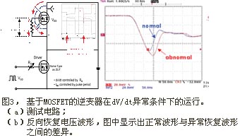 至于其反向特性 (參見圖1(a)),MOSFET中固有的體二極管可充當(dāng)IGBT逆變器中的快速恢復(fù)二極管 (FRD) ;即可以通過電子擴(kuò)散過程實(shí)現(xiàn)快速而平滑的恢復(fù)特性,同時(shí)節(jié)省了引線框內(nèi)芯片的占用空間。由于MOSFET比一般FRD尺寸大,其反向壓降小,而且在柵極為高時(shí),該壓降甚至?xí)?,這是因?yàn)镸OSFET溝道本身就允許雙向電流。