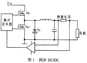 Vin為輸入電壓,VM1、VM2為MOSFET,VM1導(dǎo)通寬度決定輸出電壓大小,快恢復(fù)二極管和VM2共同續(xù)流電路,整流管的導(dǎo)通損耗占據(jù)最主要的部分,因此它的選擇至關(guān)重要,試驗(yàn)中選用通態(tài)電阻很低的M0SFET。電感、電容組成濾波電路。測(cè)量電阻兩端電壓與給定值比較后,通過(guò)脈沖發(fā)生器產(chǎn)生相應(yīng)的脈寬,保持負(fù)載電流穩(wěn)定。VM1關(guān)斷,快恢復(fù)二極管工作,快恢復(fù)二極管通態(tài)損耗大,VM2接著開(kāi)通續(xù)流,減少系統(tǒng)損耗。