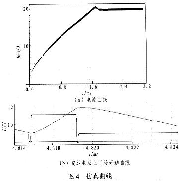 圖3中,R1,R2為電壓測(cè)量電阻,Rc為電流測(cè)量電阻。調(diào)節(jié)R1可以設(shè)定最大輸出電壓。Rc限制最大輸出電流。當(dāng)最大電壓或電流其中一個(gè)達(dá)到給定值,則脈沖寬度最大。這樣可以保證負(fù)載正常工作。