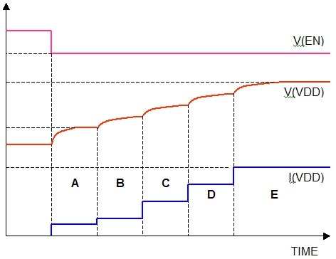 在A部分,通過限制流過分?jǐn)嚅_關(guān)的電流來減少負(fù)載電容充電時的浪涌電流;在B部分,升壓轉(zhuǎn)換器的開始電流限制在25%;在C部分,電流限制設(shè)在50%;在D部分電流限制為75%;在E部分,電流限制為100%。
