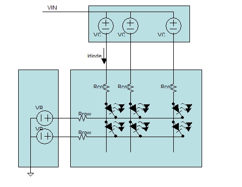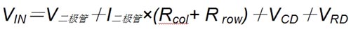 其中:V二極管是二極管的前向壓降;I二極管是流經(jīng)二極管的電流;Rcol是列連接的電阻;Rrow是行金屬的電阻;VCD是列驅(qū)動器所需的開銷;VRD是行驅(qū)動器所需的開銷;在典型應(yīng)用中,VIN大約為20V。