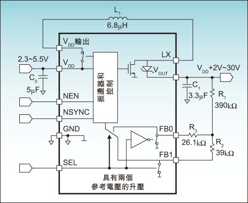 典型的反饋電壓是1.15V±2%。當(dāng)選擇引腳(SEL)設(shè)置為低時,F(xiàn)B0反饋引腳就與參考電壓進行比較,F(xiàn)B1引腳接地,用以提供反饋參考地。當(dāng)SEL為高時,F(xiàn)B1用作參考電壓,F(xiàn)B0接地。輸出電壓可用公式5和公式6計算: