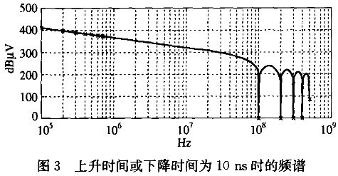 開關(guān)信號(hào)的上升和下降沿對(duì)干擾的幅值影響很大,圖3是上升時(shí)間或下降時(shí)間為10ns時(shí)的上升沿或下降沿的頻譜,把上升時(shí)間或下降時(shí)間改為100ns再仿真時(shí)發(fā)現(xiàn):當(dāng)上升時(shí)間或下降時(shí)間增加時(shí),隨著頻率的升高,幅值減小的越快,也就是說,上升或下降時(shí)間的變化對(duì)高頻干擾幅值影響更大。表1中列出了上升時(shí)間或下降時(shí)間為10ns和100ns時(shí),不同頻率的電磁干擾幅值和比較結(jié)果。從圖中還可以看出在頻率為