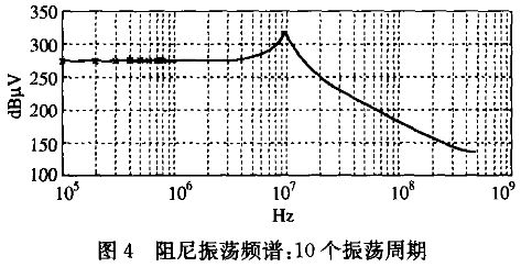 為了研究阻尼振蕩對(duì)電磁干擾的影響,本文同樣單獨(dú)對(duì)其進(jìn)行了研究,圖4為其頻譜,