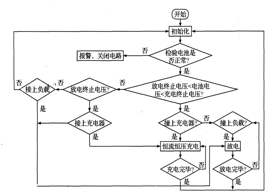 程序開始執(zhí)行后, 首先進(jìn)行初始化并檢測(cè)電池電壓、電流、溫度等信息是否正常。 如正常則進(jìn)入下一步。 否則報(bào)警并關(guān)閉電路。 如果電池電壓在充電終止電壓和放電終止電壓之間, 說明電池既可充電也可放電。 此時(shí)電路將判斷接上充電機(jī)還是接上負(fù)載。 以進(jìn)行相應(yīng)的充電和放電。 如果兩者都沒有接則循環(huán)檢測(cè)過程。 若電池電壓已經(jīng)到達(dá)充電終止電壓。 則等待負(fù)載的接入進(jìn)行放電;同樣若電池電壓己經(jīng)達(dá)到放電終止電壓,則等待充電器的接入以進(jìn)行充電。 在整個(gè)過程中,該電路將始終實(shí)時(shí)檢測(cè)電池信息,若有異常情況發(fā)生,則立即利用中斷信號(hào)終止正在進(jìn)行的充電或者放電過程,關(guān)斷充放電回路,同時(shí)進(jìn)行報(bào)警并提示報(bào)警原因。