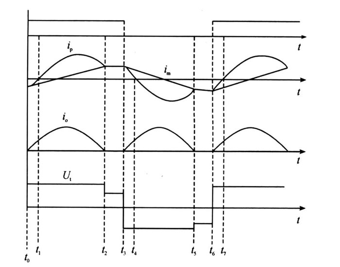 在下半個(gè)周期中, 電路的工作與上半個(gè)周期剛剛相似,只是方向相反。整個(gè)周期的電路工作波形:在上半個(gè)周期中,開關(guān)管Q1 為零電壓導(dǎo)通, 而Q1 在t3 時(shí)刻的關(guān)斷電流im 很小; 在下半個(gè)周期中,開關(guān)管Q2 為零電壓導(dǎo)通,而Q2 在t6 時(shí)刻的關(guān)斷電流im 很小,所以Q1 、Q2 工作時(shí)的開關(guān)損耗很小。