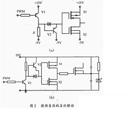 功率MOSFET屬于電壓型控制器件,只要柵極和源極之間施加的電壓超過其閾值電壓就會導(dǎo)通。由于MOSFET存在結(jié)電容,關(guān)斷時(shí)其漏源兩端電壓的突然上升將會通過結(jié)電容在柵源兩端產(chǎn)生干擾電壓。常用的互補(bǔ)驅(qū)動電路的關(guān)斷回路阻抗小,關(guān)斷速度較快,但它不能提供負(fù)壓,故其抗干擾性較差。為了提高電路的抗干擾性,可在此種驅(qū)動電路的基礎(chǔ)上增加一級由V1、V2、R組成的電路,產(chǎn)生一個(gè)負(fù)壓,電路原理圖如圖2(a)所示。