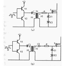 圖1(a)為常用的小功率驅(qū)動電路,簡單可靠成本低。適用于不要求隔離的小功率開關(guān)設(shè)備。圖1(b)所示驅(qū)動電路開關(guān)速度很快,驅(qū)動能力強(qiáng),為防止倆個(gè)MOSFET管直通,通常串接一個(gè)0.5~1Ω小電阻用于限流,該電路適用于不要求隔離的中功率開關(guān)設(shè)備。這兩種電路結(jié)構(gòu)特簡單。