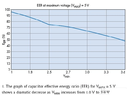 其中EMAX代表電容器存儲的總能量。等式2明確表明,隨著我們通過減少電容器內的駐留電能,而降低了被供電電路的最低工作電壓VMIN,有效能效比可獲得極大地提升。對任何以電容供電的電路來說,能效比都是一個非常重要的設計考慮?! ?br />