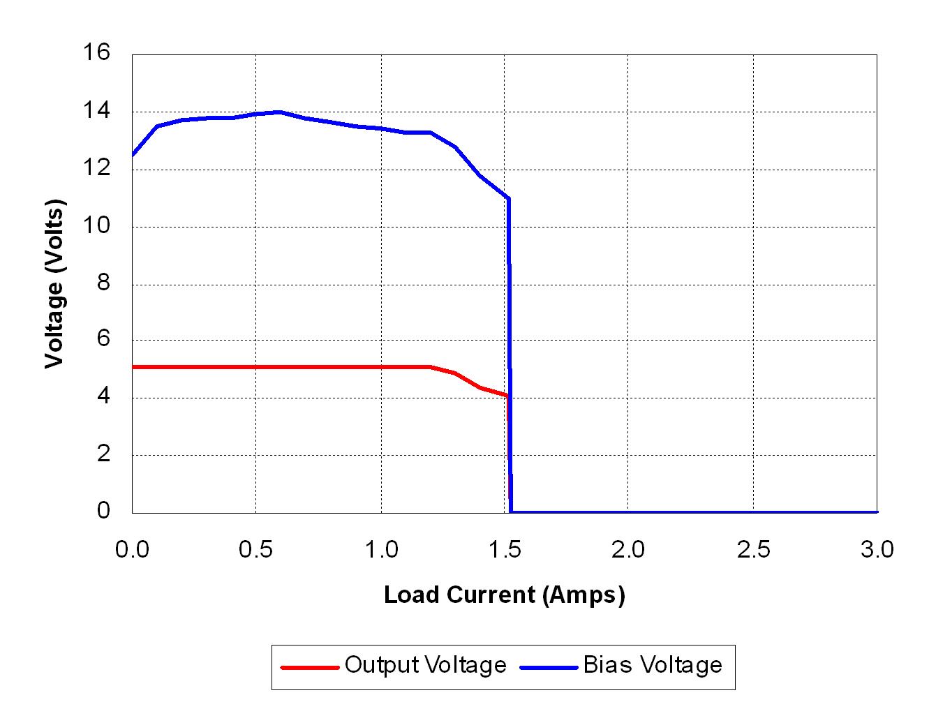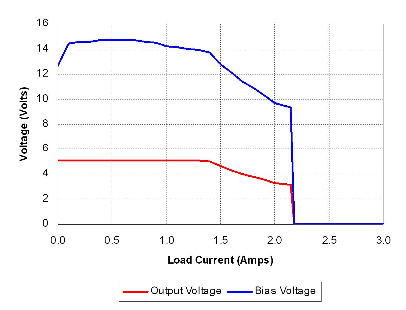 圖3顯示了輸出和偏置電壓與圖2所示電路負(fù)載電流的對比情況。輸出V-I特性非常接近于圖1所示理想情況。負(fù)載電流達(dá)到約1.3A時開始功率限制。隨著負(fù)載增加,輸出電壓開始下降。由于偏置電壓是輸出電壓的反映,因此它也開始下降。偏置電壓降至9V關(guān)閉水平以下時,PWM控制器關(guān)閉。