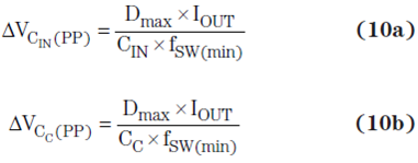 方程式 10a 和 10b 計算了完全由各自電容器電容值引起的輸出紋波電壓部分:
