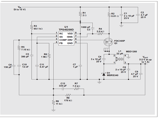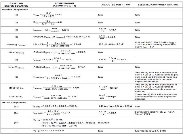 就本例而言,諸多要求都是針對一個 η= 0.9 峰值效率的 12-V、1-W 電源。負載為穩(wěn)態(tài),因此幾乎看不到負載瞬態(tài)。2-A 輸入電源為 9 到 15V。我們選擇了異步電壓模式控制器即 TI TPS40200,其工作在 340 和 460kHz 之間的開關(guān)頻率下。輸入端和快速電容器的最大允許紋波分別為彼此交叉最大電壓的 1%。最大輸出紋波為 25 mV,而最大環(huán)境溫度為 55ºC。由于 EMI 并不是問題,通過使用最小輸入電壓,我們選擇了具有更低電感值的電感。下一頁的表 1 概括了前面介紹的一些設(shè)計計算方法。我們忽略了方程式 7 到 9 以及方程式 11,因為使用了高 RMS 電流額定值的低 ESR 陶瓷電容。