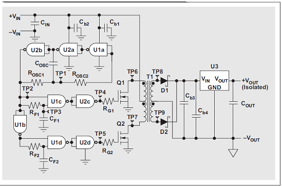 如果應(yīng)用要求 2 kV 以上的隔離電壓、60% 以上的轉(zhuǎn)換器效率或者標(biāo)準(zhǔn)組件可靠的有效性,那么分立設(shè)計(jì)就是一種能夠替代集成組件的低成本方案。分立 DC/DC 轉(zhuǎn)換器設(shè)計(jì)的缺點(diǎn)是需要做大量的工作——選擇穩(wěn)定的振蕩器結(jié)構(gòu)和先斷后通電路,選擇可以通過標(biāo)準(zhǔn)邏輯門有效驅(qū)動(dòng)的MOSFET,適宜實(shí)施溫度和長(zhǎng)期可靠性測(cè)試。所有這些努力都要花費(fèi)時(shí)間和資金。因此,在倉(cāng)促進(jìn)行這樣一個(gè)計(jì)劃以前,設(shè)計(jì)人員應(yīng)該考慮到下列事項(xiàng):集成組件通常已通過溫度測(cè)試,并且擁有其他工業(yè)資質(zhì)。這些組件不僅僅是最可靠的解決方案,而且還擁有較快的上市時(shí)間。