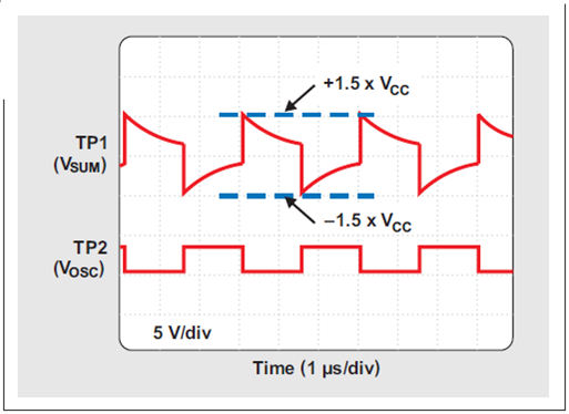 著名的三反相門振蕩器由 U1a、U2a 和 U2b 組成,選擇它是因?yàn)樗诠╇姴▌?dòng)方面較為穩(wěn)定。通過一個(gè) 100-pF 陶瓷電容器(COSC)和兩個(gè) 10-kΩ 電阻器(ROSC1 和 ROSC2),它的正常頻率被設(shè)定為 330kHz。在 3.0-V 到 3.6-V 電源電壓波動(dòng)范圍內(nèi),振蕩器擁有接近 50% 的占空比,以及低于 ±1.5% 的最大頻率波動(dòng)。圖 2 顯示了 ROSC1 和 ROSC2 (TP1) 相加點(diǎn)和振蕩器輸出 (TP2) 處的波形。所有電壓均為參考電路基準(zhǔn)電壓測(cè)得。[page]