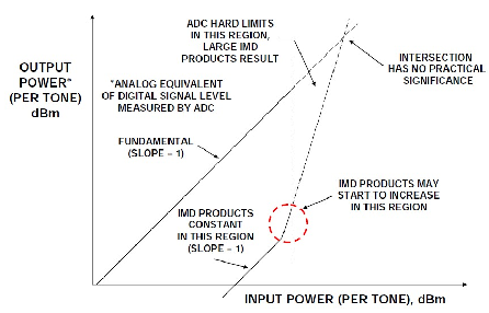 類似地,信號每增加1 dB,三階IMD (IMD3)幅度就增加3 dB,如圖中slope = 3 曲線所示?! ?br />