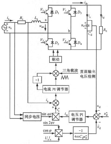 單相全橋電壓型PWM 整流器選擇響應(yīng)速度較快的三角波電流比較法作為控制策略。因反饋到電壓外環(huán)的輸出電壓含有紋波電壓,而紋波電壓的存在將導(dǎo)致電流內(nèi)環(huán)的給定電流發(fā)生畸變,因此本文采用補(bǔ)償輸出直流電壓中紋波電壓的方法[4]來減少流入電壓控制環(huán)的紋波電壓,從而改善給定電流的波形。按照以上原理設(shè)計的單相全橋電壓型PWM整流器的控制系統(tǒng)結(jié)構(gòu)如圖4所示。