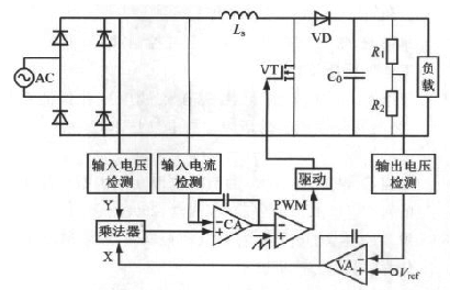 工作原理:APFC主電路的輸出電壓經(jīng)電阻分壓后與基準(zhǔn)電壓相比較,誤差值輸入到VA;VA 輸出信號X與輸入電壓檢測信號Y一起輸入乘法器,經(jīng)過平均化處理、放大、比較后,再經(jīng)過PWM 比較器加到柵極驅(qū)動器,產(chǎn)生對開關(guān)管VT的控制信號,從而使電感Ls上的電流(即輸入電流)平均值始終跟蹤模擬乘法器輸出的半正弦信號,即跟蹤了輸入電壓波形,并實(shí)現(xiàn)了輸入電流正弦化,使功率因數(shù)接近1,達(dá)到校正功率因數(shù)的目的?! ?br />