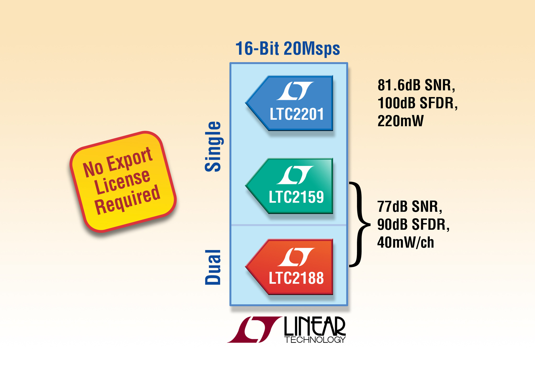 近日,凌力爾特公司 (Linear Technology Corporation) 非常高興地宣布三款新的 16 位 20Msps ADC 擁有出口管制分類號 (ECCN) 3A991,因此這些器件無需美國的出口許可證,就可向中國、俄羅斯以及其他有關(guān)國家供貨。