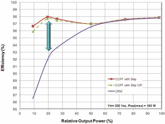 采用CCFF控制架構(gòu),最大的好處莫過(guò)于提升能效。采用傳統(tǒng)CrM(臨界導(dǎo)電模式)/BCM(邊界線(xiàn)導(dǎo)電模式),在負(fù)載降低時(shí),開(kāi)關(guān)頻率上升;負(fù)載極低時(shí),控制器可能進(jìn)入“跳周期模式”,滋生可聽(tīng)噪聲。而采用CCFF控制架構(gòu),可以在負(fù)載降低時(shí)降低開(kāi)關(guān)頻率,減小功率損耗;在輕載時(shí),控制器可以鉗位高于可聽(tīng)噪聲頻段的較低頻率;負(fù)載極低時(shí),則采用跳周期模式工作(可以輕易關(guān)閉)。因此,這種谷底導(dǎo)通可進(jìn)一步提升能效,減小電磁干擾。圖4比較了基于NCP1611CCFF PFC及傳統(tǒng)CrM PFC在不同負(fù)載條件下的能效。由圖中可見(jiàn),在10%輕載條件下,基于帶跳周期模式的NCP1611的演示板的能效高達(dá)近97%(關(guān)閉跳周期模式下也達(dá)近96%),而基于傳統(tǒng)CrM架構(gòu)的演示板能效僅為近87%,相關(guān)近10%??梢?jiàn)NCP1611在提升電源輕載能效方面表現(xiàn)尤為優(yōu)異。