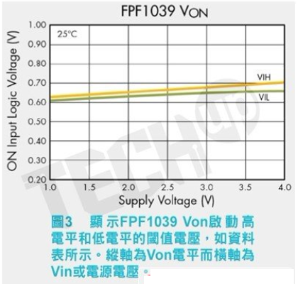 資料表中的規(guī)格增加了針對(duì)製程、電壓和溫度變化的緩衝,表明Von必須超過(guò)1.0V來(lái)開(kāi)啟開(kāi)關(guān),并且必須低于0.4V來(lái)關(guān)閉開(kāi)關(guān)。這帶來(lái)了非常簡(jiǎn)單的驅(qū)動(dòng)電路,可以直接連接至微處理器。此Von規(guī)格隨元件而不同且可能不一定會(huì)如圖3那樣平坦。不要停留在資料表中顯示靜態(tài)閾值電平的那一行;可以參照曲線(xiàn)來(lái)瞭解全部詳情。