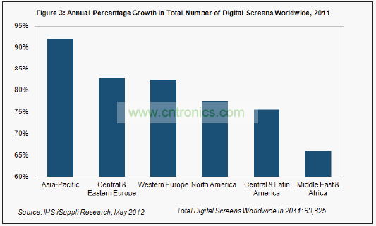 去年亞太地區(qū)數(shù)字電影增長高達(dá)92%,中東/非洲市場增長約66%,如圖3所示。本報告定期追蹤的其它地區(qū)包括中歐與東歐;西歐;包括加拿大和美國在內(nèi)的北美地區(qū);中美洲與拉美。